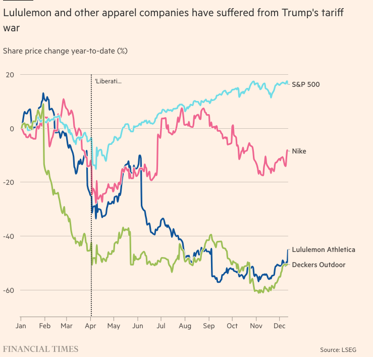 尽管在12月中旬,由于首席执行官即将离职的消息传来后有所反弹,但高端运动休闲零售商露露柠檬的股价今年已经损失了近一半的价值。这家价值250亿美元的高档瑜伽裤制造商受到了特朗普关税以及美国消费者面临的成本压力、产品失误和竞争加剧的打击。