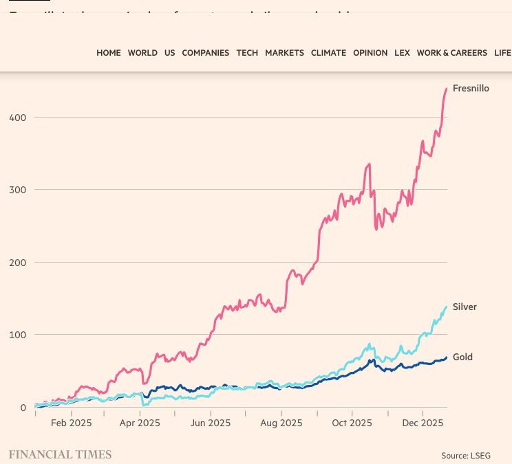 像弗雷斯尼洛这样的公司,一家总部位于墨西哥城的白银生产商,一直在乘着这股浪潮:该公司在2025年上涨了五倍,成为伦敦蓝筹股富时100指数中表现最好的股票。