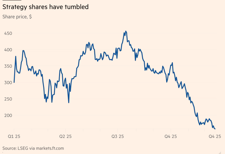 这家全球最大的比特币企业持有者度过了糟糕的一年。Strategy的股价在2025年上半年飙升,它激励了全球数百家公司效仿其商业模式,即从债务和股票市场筹集资金,用于积极购买加密货币。