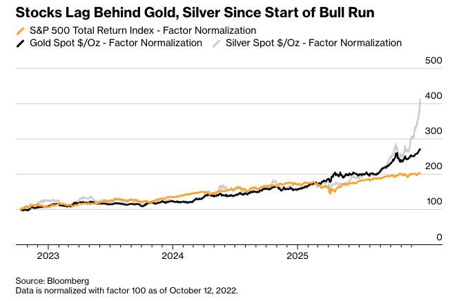 他们指出,虽然自 2022 年 10 月牛市开始以来,标普 500 指数(以总回报计算)已经翻了一番,但所有三种贵金属的表现都超过了同期内的股票指标。
