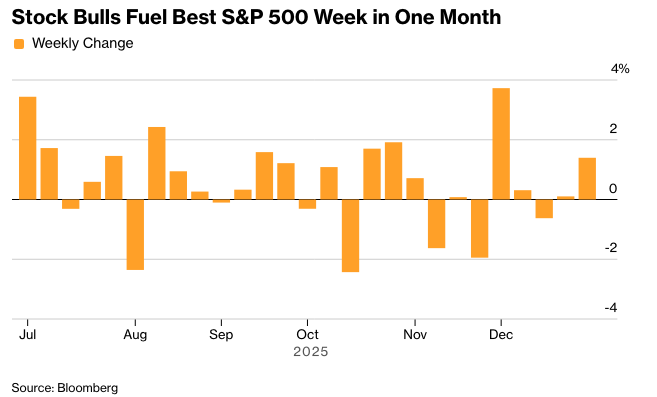 尽管标准普尔500指数在交易放缓的情况下几乎没有变动,但该股指录得一个月来的最佳单周表现。大多数大型科技股下跌,但英伟达公司(Nvidia Corp.)因与人工智能初创公司Groq达成许可协议而上涨。自由港麦克莫兰公司(Freeport-McMoRan Inc.)领涨材料生产商,同时黄金价格创下历史新高。