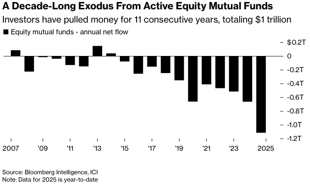 原文链接: https://www.bloomberg.com/news/articles/2025-12-26/brutal-year-for-stock-picking-spurs-trillion-dollar-fund-exodus?srnd=phx-markets