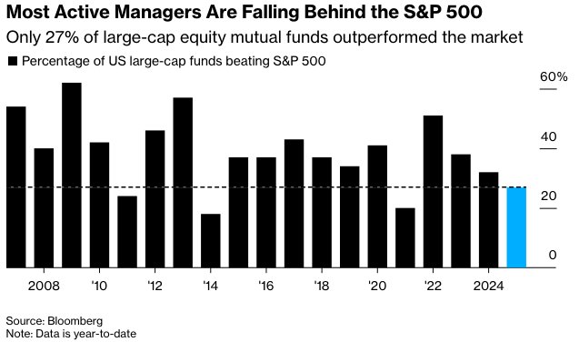 据BI的Athanasios Psarofagis称,在美国,今年有73%的股票型共同基金跑输了基准,这是自2007年有数据以来的第四糟糕表现。 在四月份的关税恐慌复苏后,这种表现不佳的情况进一步恶化,因为对人工智能的热情巩固了科技股的领导地位。