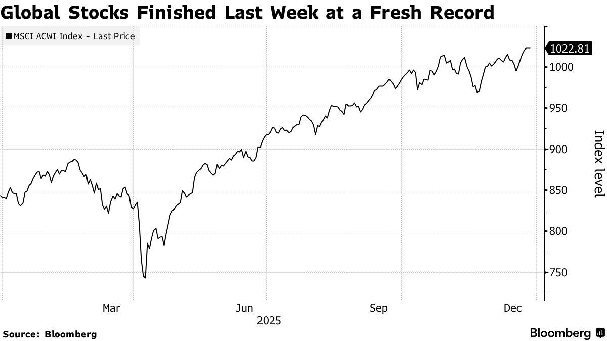 MSCI全球所有国家指数——衡量股市最广泛的指标之一——上周上涨1.4%,收于历史新高,备受期待的年终反弹行情正式开启。该指数在2025年上涨近22%,有望实现连续第三年上涨,并创下自2019年以来的最大涨幅。