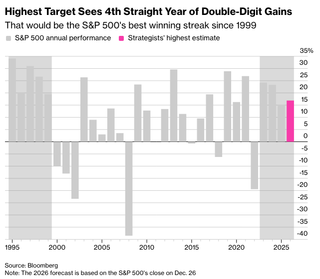 如果华尔街的预测者在2026年是正确的,那么股市将迎来自全球金融危机前以来持续时间最长的年度上涨。如果这些预测者中的最高目标得以实现,这也将标志着自20世纪90年代互联网泡沫以来,标准普尔500指数首次出现连续四年两位数的回报。