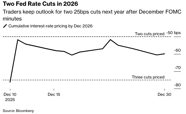 “交易员们继续倾向于明年两次降息,而不是12月初预期的三次。尽管美联储政策制定者关注劳动力市场风险,但交易员们可能仍在等待延迟发布的数据来证实这些担忧。”