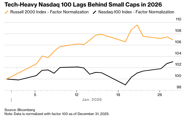 “这种‘扩大’的交易将在大型科技公司的财报发布后停止,”Senyek表示。“我们的感觉是,稳健的第四季度业绩、较低的估值以及持续的人工智能顺风因素,很可能会将投资者的兴趣拉回这些公司。”