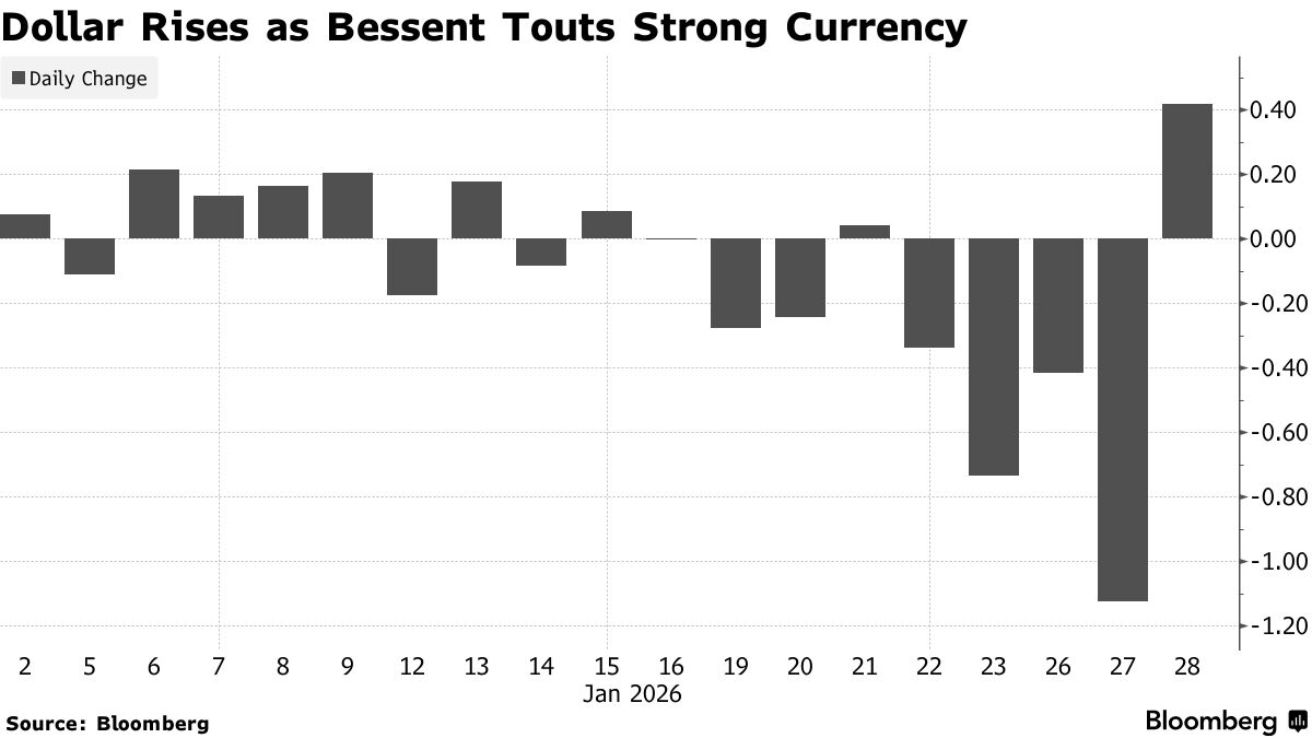 标准普尔500指数几乎没有变化。10年期美国国债收益率几乎没有变化,为4.25%。美元上涨0.4%。贝森特告诉CNBC,美国没有干预以提振日元,导致日元暴跌近1%。黄金突破5300美元。