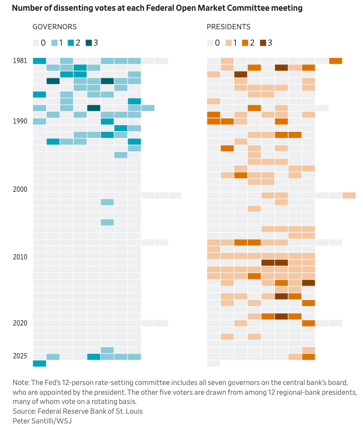 两位美联储理事——均由特朗普总统任命——对该决定持不同意见,并倾向于降息四分之一个百分点。美联储12人组成的利率制定委员会包括七位总统任命的理事和五位并非政治任命的地区银行行长。