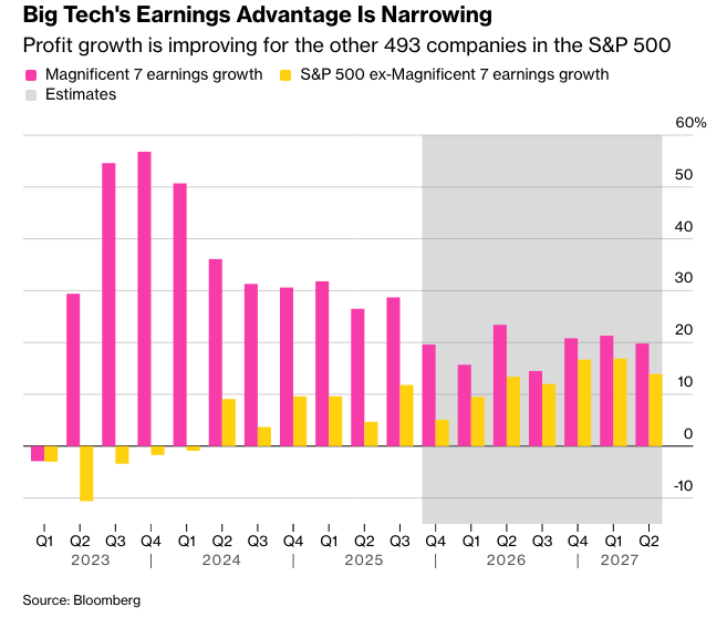 他们指出,虽然“七巨头”的盈利增长预计将在2026年的每个季度继续超过标准普尔500指数中剩余的股票,但差距预计将在全年缩小。
