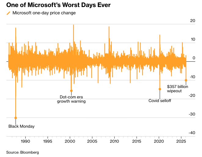 微软的抛售是其历史上最严重的之一。自1986年首次公开募股以来,该股仅在少数几天出现过更大的跌幅,包括1987年的黑色星期一、互联网泡沫破灭期间以及2020年新冠疫情引发的抛售高峰时期。