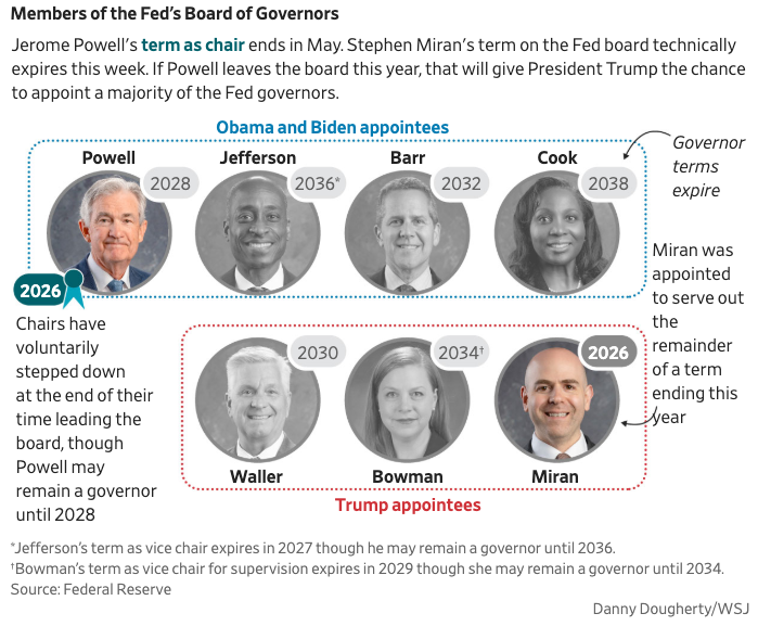 目前,特朗普在理事会中有一个预定的空缺:斯蒂芬·米兰所占据的席位,他的任期将于本周六到期。米兰可以作为临时人员留任,直到继任者获得确认,但这个席位已经有人选了——它是安装新主席的工具。