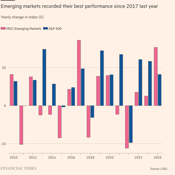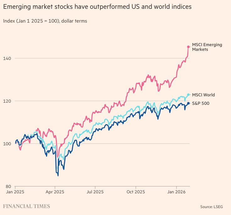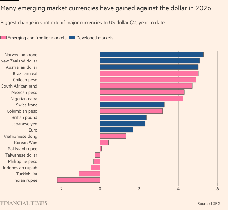 新兴市场股票、债券和货币在2026年迎来了一个开门红,美元跌至四年低点加速了投资者将投资多元化到美国以外市场的进程。