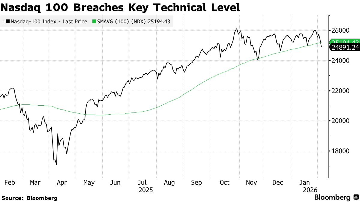 标准普尔500指数下跌0.5%。纳斯达克100指数经历了自10月以来最糟糕的两日跌势,并跌破了其100日移动平均线。iShares扩展科技软件行业ETF下跌1.8%。芯片制造商指数下滑4.4%。由于令人失望的预测,超微半导体公司(AMD)暴跌17%。