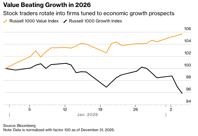 交易员们在2026年加大了从科技股转向其他领域的力度,从小盘股到价值股应有尽有,因为他们寻求能从经济增长中受益的公司。进一步表明市场广度的迹象是,等权重的标准普尔500指数——其中英伟达公司和露露柠檬公司权重相同——周三上涨了0.9%。