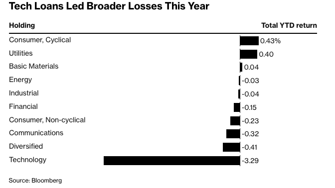 目前,杠杆贷款指数年初至今的跌幅中,软件占54%。相比之下,公用事业等行业的贷款仍显示出收益。商业发展公司(BDC),即提供了解不透明直接贷款市场的窗口的公开交易工具,已经连续九天下跌。巴克莱表示,软件约占BDC投资组合的20%。