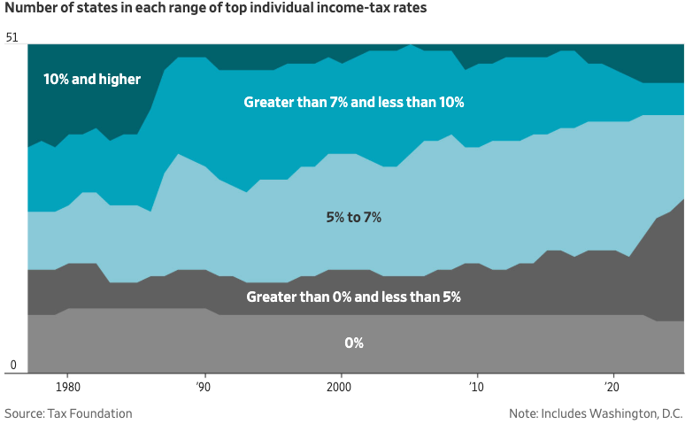 中间地带正在迅速消失。税务基金会(一个倾向于降低税率和减少优惠的组织)的数据显示,2006年,有15个州对工资收入征收的最高所得税税率低于5%,只有一个州超过10%。现在,超过一半的州已经低于5%,另有5个州加上哥伦比亚特区处于两位数。