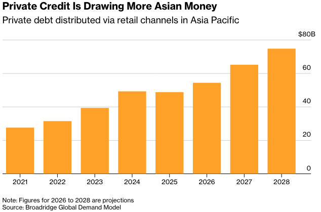 近年来,全球资产管理公司已经从财富渠道募集了数十亿美元的私募信贷基金。据数据提供商Broadridge Financial Solutions的数据显示,目前亚太地区的散户投资者持有约488亿美元的该类资产,预计到2028年将增至748亿美元。