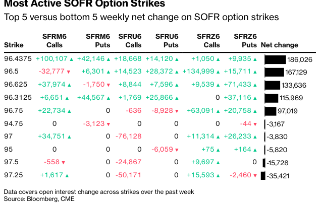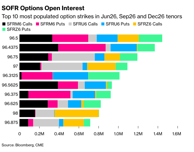 总体而言,在6月26日、9月26日和12月26日到期的期权中,成交量最大的行权价目前是96.50,其次是96.4375,这主要是因为SFRM6 96.4375/96.50看涨期权价差的持续买入,以及卖出2QM6 97.375看涨期权,这种比率牛市陡峭结构中的头寸高达约10万张,而后者为5万张。此外,9月26日到期的96.75和97.00行权价的看涨期权也存在大量的未平仓合约。