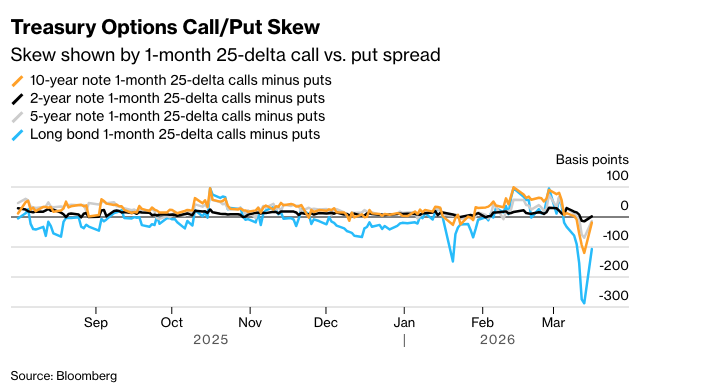 用于对冲国债期货风险的溢价已从数月高位回落,但仍然明显偏向看跌期权,尤其是在长期债券期货合约中。 这部分回撤主要发生在周一的交易时段,该时段国债收益率曲线出现相对平静,并且长期互换息差当日大幅走阔。