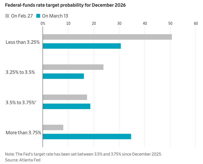 市场已经大幅重新定价。根据亚特兰大联储计算的期权价格,上周末交易员认为到12月至少降息一次的可能性为47%,低于伊朗战争上个月开始前的74%。年底前加息的可能性从同期的8%上升至35%。
