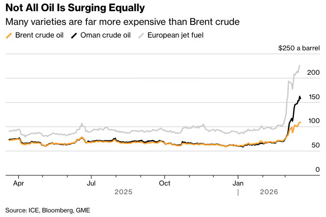 由于霍尔木兹海峡几乎完全关闭以及中东能源设施遭受袭击导致供应中断,全球布伦特原油基准价格已上涨约 50% 至每桶 110 美元左右。但几乎每一桶实物原油的成本都在飙升,因为供应紧张推高了汽油、柴油和航空燃料等消费者实际使用的产品的价格。