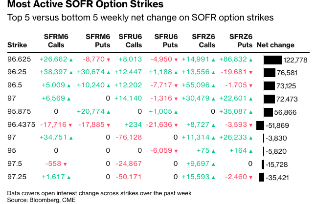 过去一周,96.625执行价的未平仓合约量大幅增加,资金流主要集中在年底的下行保护。例如,有投资者买入了12月26日到期的97.00/96.625 1x2看跌期权价差。 过去一周,96.25执行价的需求也有所增加,6月26日到期的看涨和看跌期权的未平仓合约量均有所上升——资金流包括过去一周买入的SFRM6 96.50/96.375/96.25/96.125看跌期权秃鹰组合。 96.50执行价也一直活跃,近期资金流包括买入SFRZ6 96.50/96.75/97.00/97.25看涨期权秃鹰组合,SFRM6 96.50/96.375/96.25/96.125看跌期权秃鹰组合和SFRM6 96.50/96.375/96.3125/96.1875看跌期权秃鹰组合。