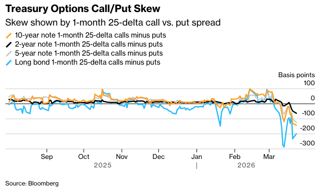 用于对冲国债期货风险而支付的溢价继续远离数月来的极端水平,但仍然严重偏向看跌期权的溢价,尤其是在较长期限的合约中。