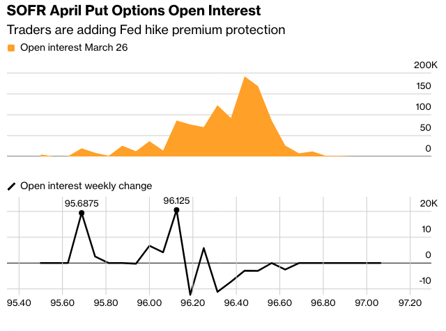 在追踪美联储政策的期权市场上,出现了对与担保隔夜融资利率挂钩的押注的需求,这些押注与最早在两周内提高利率相一致。如果债券市场在4月29日的政策会议之前大幅提高加息预期,这些交易将会获利。