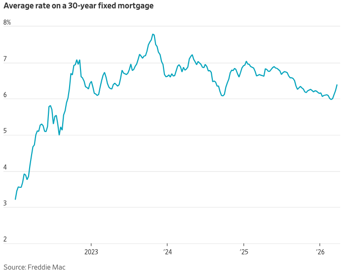 抵押贷款利率在二月底跌破6%,为2022年以来的首次,但此后一路飙升。伊朗战争以及随之而来的油价上涨,刺激了人们对美联储将长期维持短期利率在高位的预期。