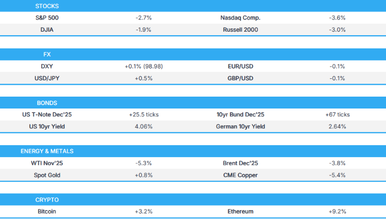 - 美国股市周五暴跌,避险资产上涨,此前美国总统特朗普重新点燃了贸易担忧,他威胁要对中国实施大规模关税,以回应中国稀土出口管制,并表示正在考虑其他对策。他还表示,鉴于事态升级,似乎没有必要与中国国家主席习近平举行面对面会晤。这条在Truth Social发布的帖子对全球股市造成了严重打击,所有指数均下跌,除必需消费品板块外,所有板块也均受到冲击。美元因该消息而被抛售,因为它增加了贸易不确定性,而澳元和纽元等受中国影响较大的货币遭受了最严重的打击,日元和瑞士法郎表现优异。此外,油价在避险情绪下被抛售,加剧了加沙停火后的下行压力。