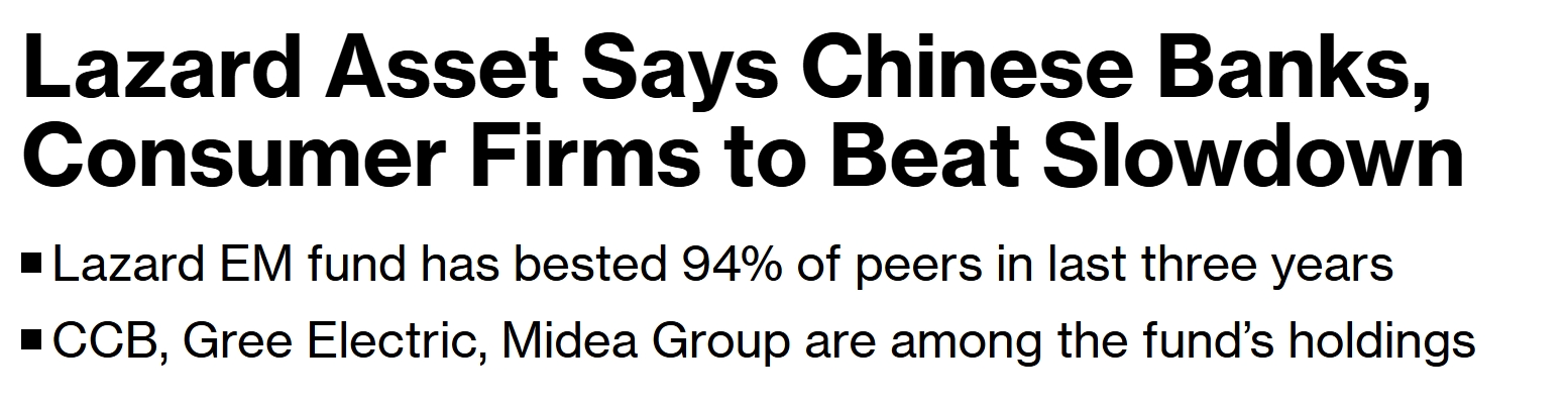 彭博--Lazard Asset Says Chinese Banks, Consumer Firms to Beat Slowdown
