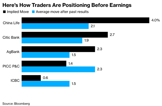 与此同时,交易员预计中国人寿和中信银行等公司的股票财报日波动性将高于以往,而他们认为工商银行的波动幅度较小。