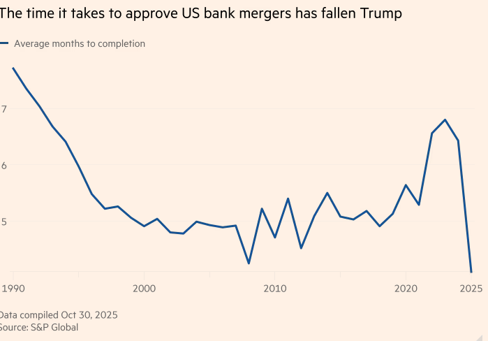 在美国特朗普政府领导下,监管机构批准银行合并的速度达到了三十多年来最快水平,打破了长期以来在分散行业中的僵局。