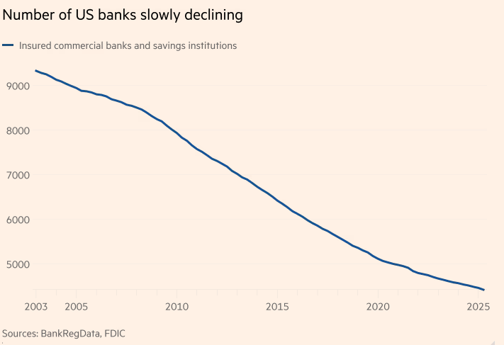 几十年来,美国银行的数量一直在减少,从 20 年前的约 9,000 家减少到今天的约 4,400 家。但与英国或加拿大等少数几家贷款机构占据主导地位的国家相比,美国市场仍然拥挤得多。