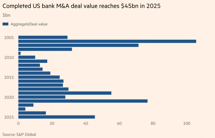 今年迄今已完成近 150 起银行并购案,总价值约 450 亿美元,使 2025 年有望成为自 2021 年以来该行业交易最繁忙的一年。