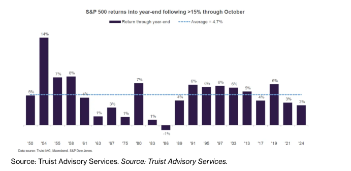 他说,当标普500指数在10月份上涨超过15%时,历史表明这种势头通常会延续到年底。自1950年以来,在75年中,有21年的年初至今价格回报率超过了这个门槛。在这些年份中,11月和12月平均带来了4.7%的收益。