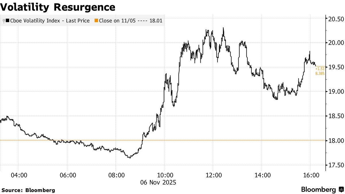 股市连续三天内第二次遭到抛售,而10年期国债收益率在挑战者、格雷和圣诞公司的数据显示10月份裁员人数创20多年来最高纪录后,跌幅达到近一个月来最大。纳斯达克100指数下跌1.9%,一项备受关注的波动率指数一度突破20。