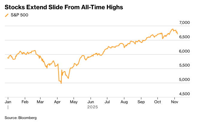 标准普尔500指数下跌1.1%。英伟达和特斯拉领跌大型科技股。瑞银美国人工智能赢家指数下跌近3%。