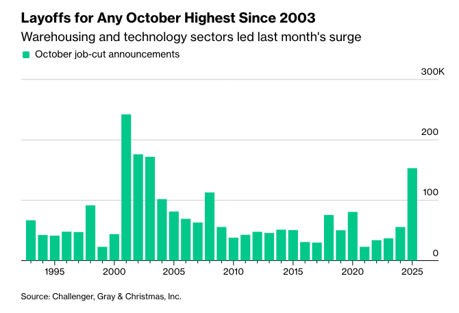 各公司上个月宣布裁员 153,074 人,几乎是去年同期的三倍,主要受科技和仓储行业驱动。Challenger 公司的首席营收官 Andy Challenger 表示,这是自 2003 年以来 10 月份裁员人数最多的一次,当时手机的出现也具有类似的颠覆性。