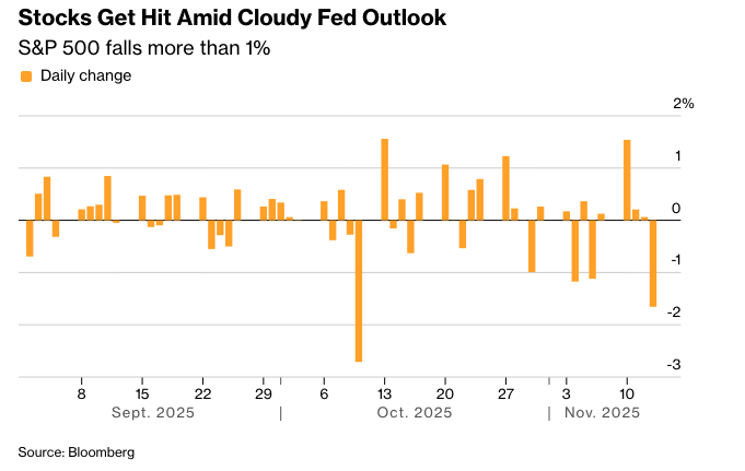 华尔街再度出现抛售潮,结束了此前因美国政府重新开放而带来的一周喘息。美联储官员在大量经济数据公布前发表鹰派言论,刺激交易员抛售从科技股到加密货币等风险资产。