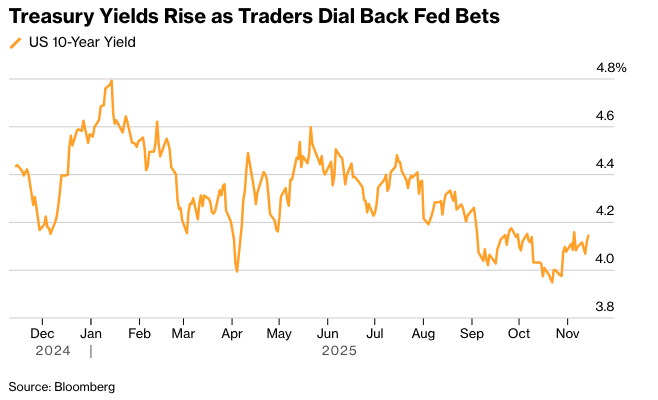 美国历史性的停摆结束带来的缓解情绪让位于本周的波动,因为多位美联储官员的讲话降低了市场对政策放松的押注。人工智能等受动量交易者青睐的热门领域剧烈震荡。比特币在2025年的涨幅几乎为零。标普500指数短暂抹去1.4%的跌幅后,收盘几无变动。英伟达公司在财报公布前上涨。