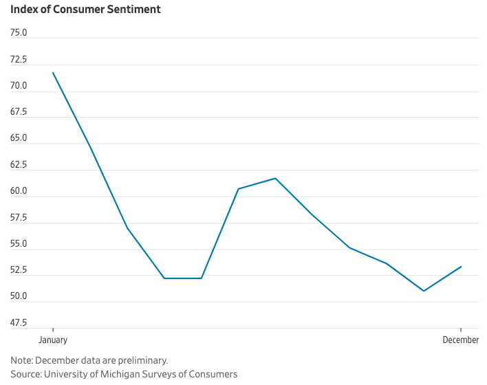 美国家庭在接近年底时,对经济的感受比年初时悲观得多,尽管他们仍在继续消费。