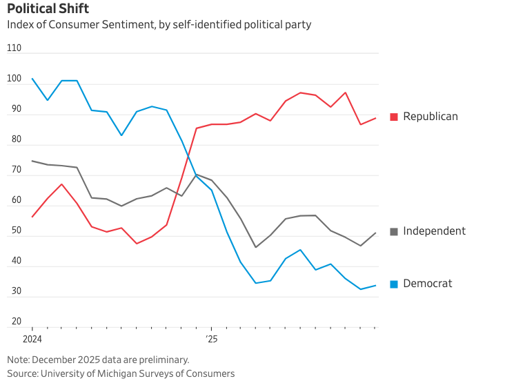 今年春天,由于总统的关税政策导致市场暴跌并加剧了对通货膨胀的担忧,该月度数字再次接近历史最低点。年中回升并超过60后,由于人们越来越担心劳动力市场招聘放缓,以及政府停摆,消费者情绪指数再次下跌。