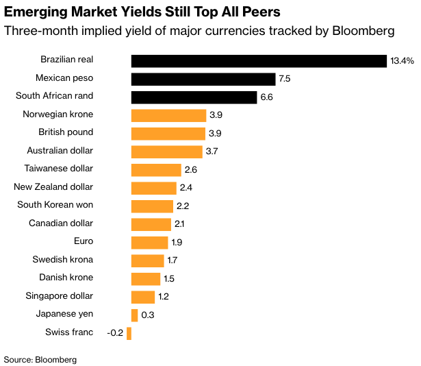 今年投资者有很多选择颇具吸引力的套利交易,新兴市场股票、债券和货币都录得了强劲涨幅。巴西和哥伦比亚等基准利率仍然较高的国家,其货币兑美元汇率上涨超过13%。