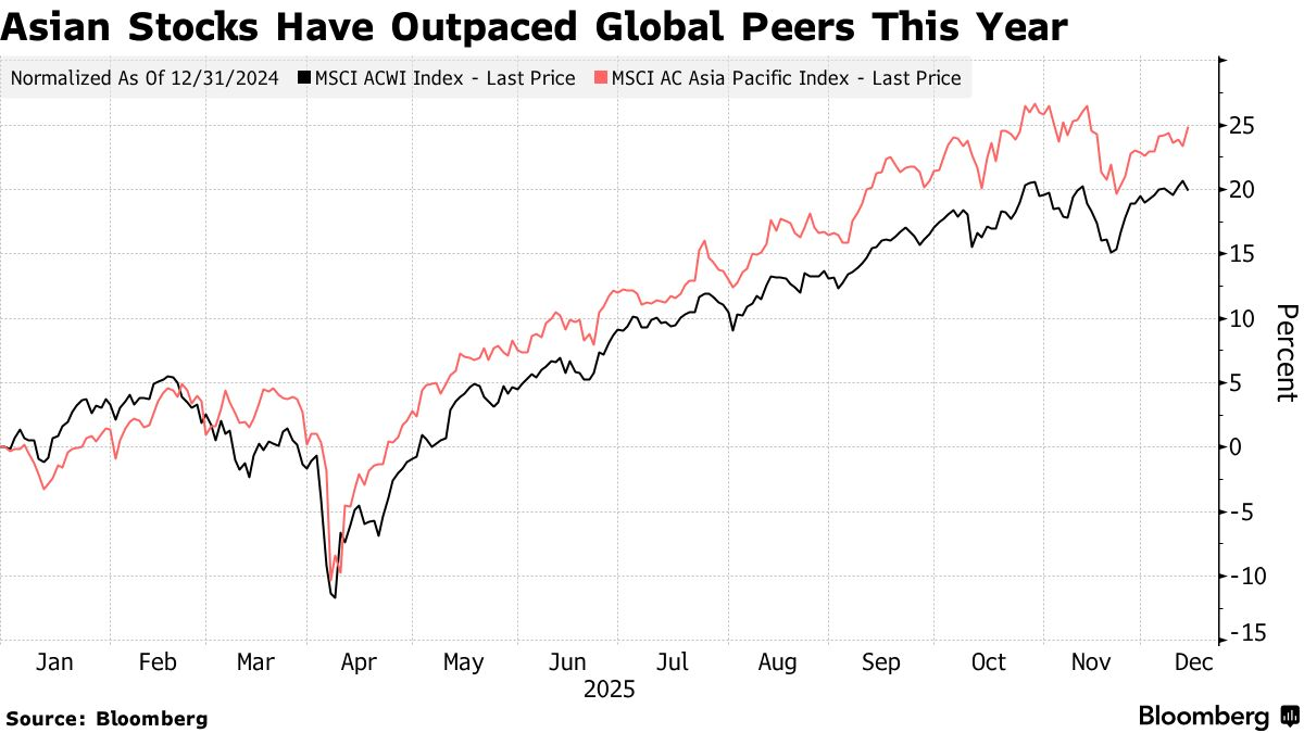 全球风险情绪一直在减退,原因是人们怀疑科技股——自三年前牛市开始以来已上涨约300%,并负责推动全球基准指数创下历史新高——是否能够继续证明其高估值和激进的人工智能支出的合理性。 鉴于该地区严重依赖于制造为技术繁荣提供动力的组件,今年表现优于全球同行的亚洲市场看起来尤其容易受到影响。