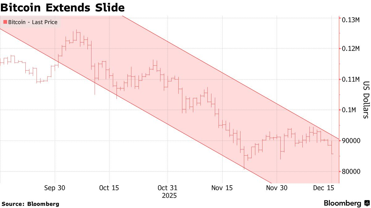 原文链接:https://www.bloomberg.com/news/articles/2025-12-15/bitcoin-breaches-86-000-while-sinking-toward-year-s-lows?srnd=phx-markets