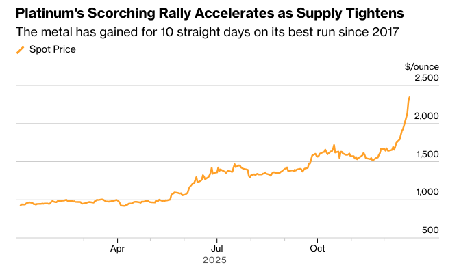 根据彭博社汇编的数据,今年迄今为止,它已经上涨了约140%,是年度涨幅最大的一次。最新的上涨是由于伦敦市场出现收紧迹象,各银行将金属,类似于白银,存放在美国,以规避关税风险。铂金今年也将连续第三年出现供应短缺,原因是主要生产国南非的供应中断。