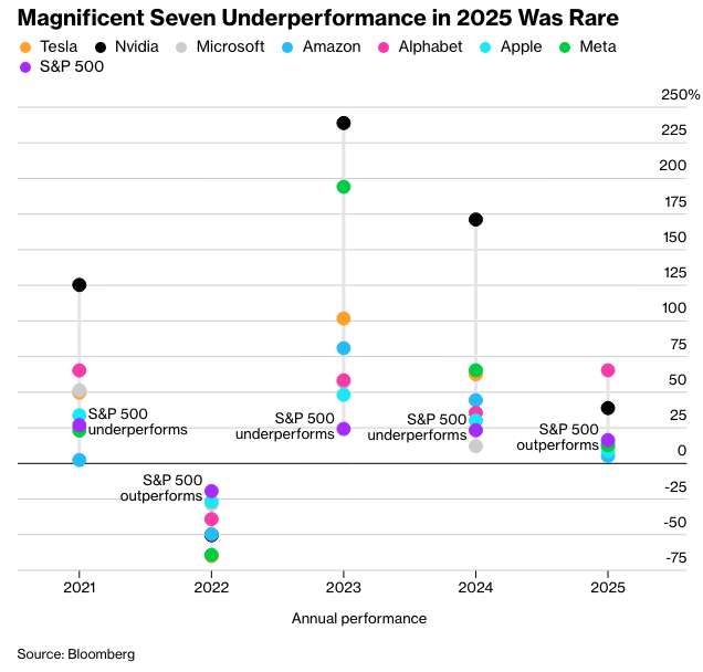 在很长一段时间里,这个策略带来了丰厚的回报。但去年,情况并非如此。自2022年美联储开始加息以来,七大科技巨头(Magnificent 7)中的大多数表现首次逊于标准普尔500指数。虽然彭博七大科技巨头指数在2025年上涨了25%,而标准普尔500指数上涨了16%,但这仅仅是因为Alphabet公司和英伟达公司的巨大收益。