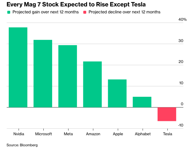 该股去年上涨超过65%,是“七巨头”中表现最佳的。但它还能涨多少? 该公司市值接近4万亿美元,股价约为预估收益的28倍,远高于五年平均水平的20倍。分析师的平均目标价仅预测今年上涨3.9%。